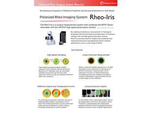 The polarized rheo-imaging system Rheo-Iris uniquely combines Anton Paar’s rheometer (MCR series) with the polarized high-speed camera CRYSTA. This integration allows researchers to obtain rheological property data and visualize structural changes in real time. Such simultaneous analysis greatly accelerates the development of new materials and the optimization of materials for specific applications.