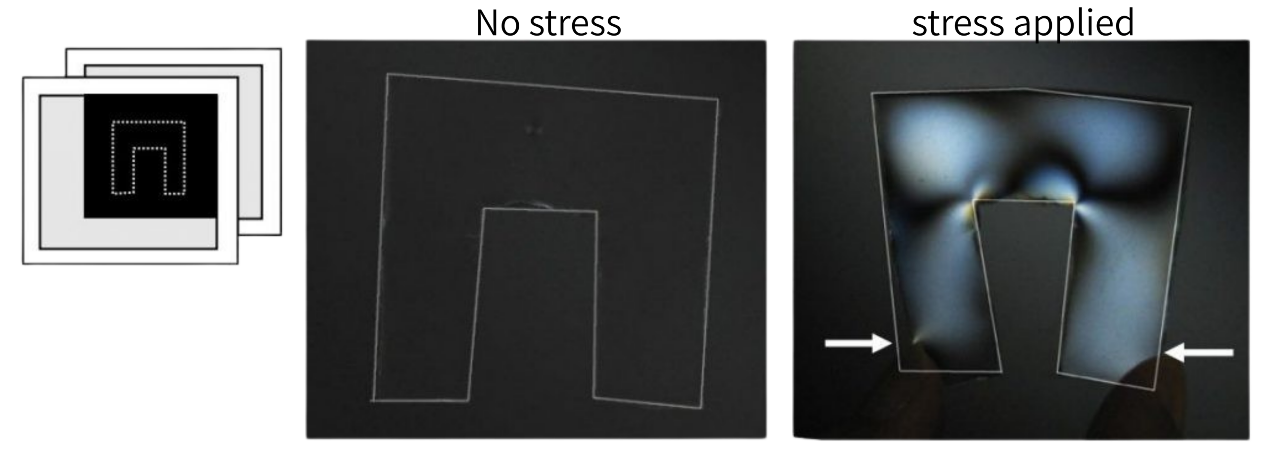 複屈折性のない透明材料でも、応力により複屈折が発生する。