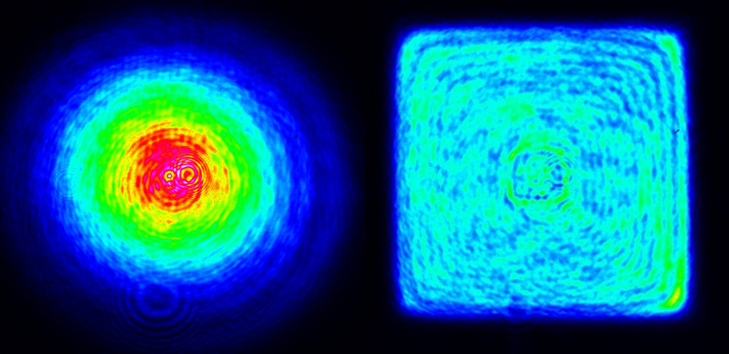 フォトニック結晶を使った偏光ビームシェイパーによってビームシェイプがガウシアンからボックスに変化した様子